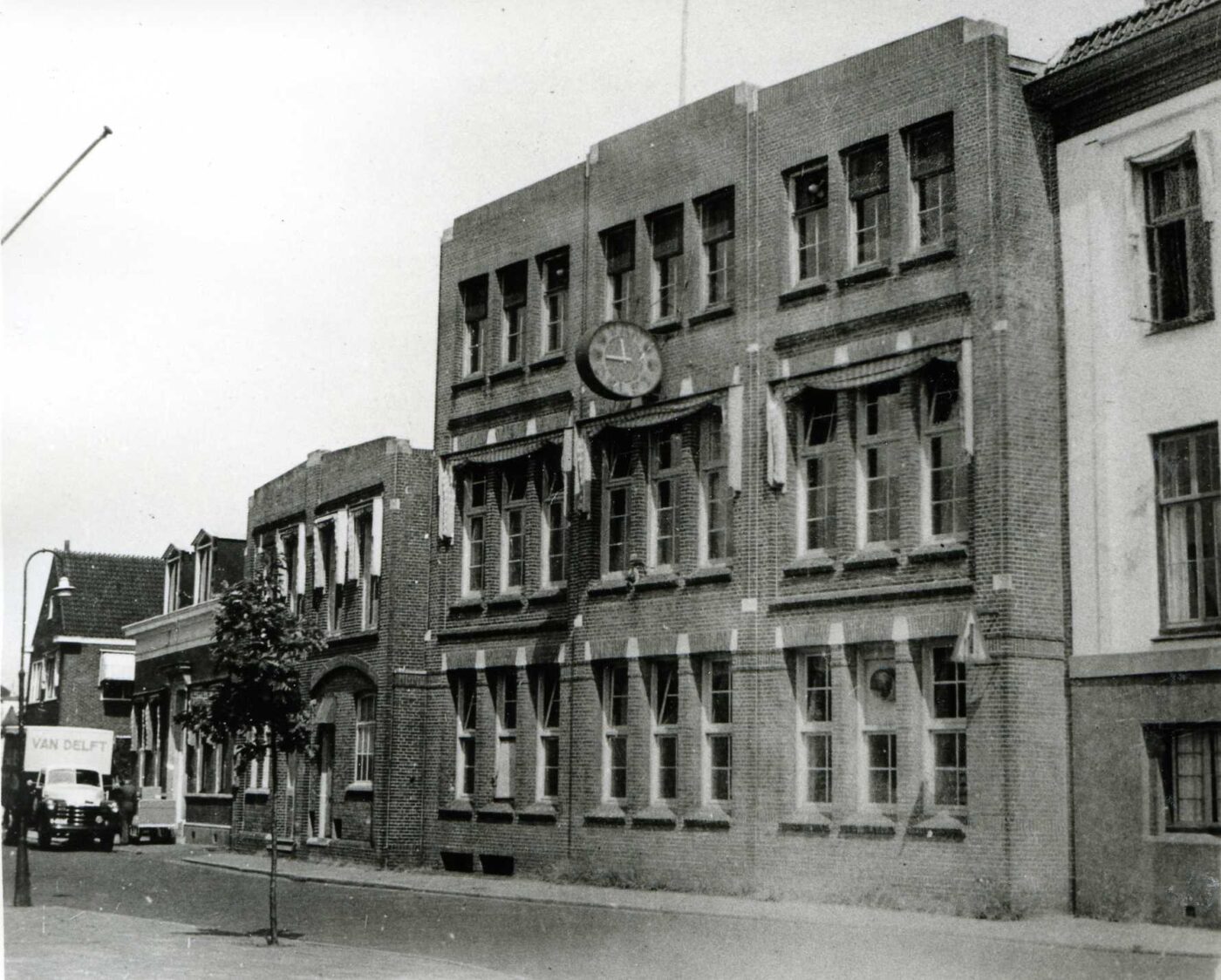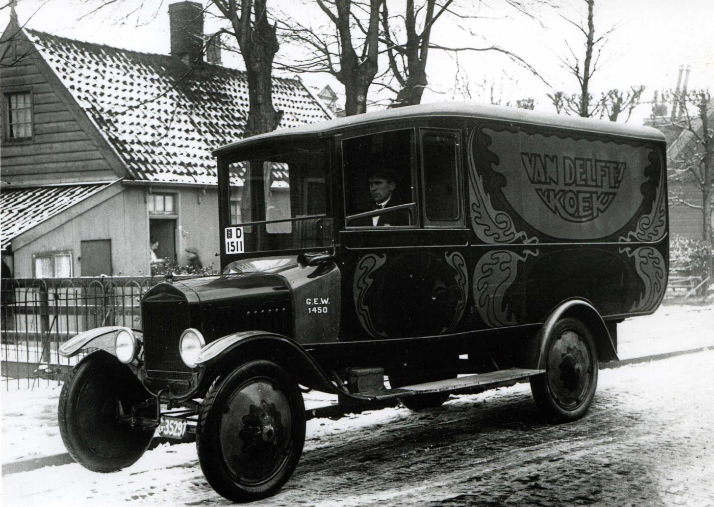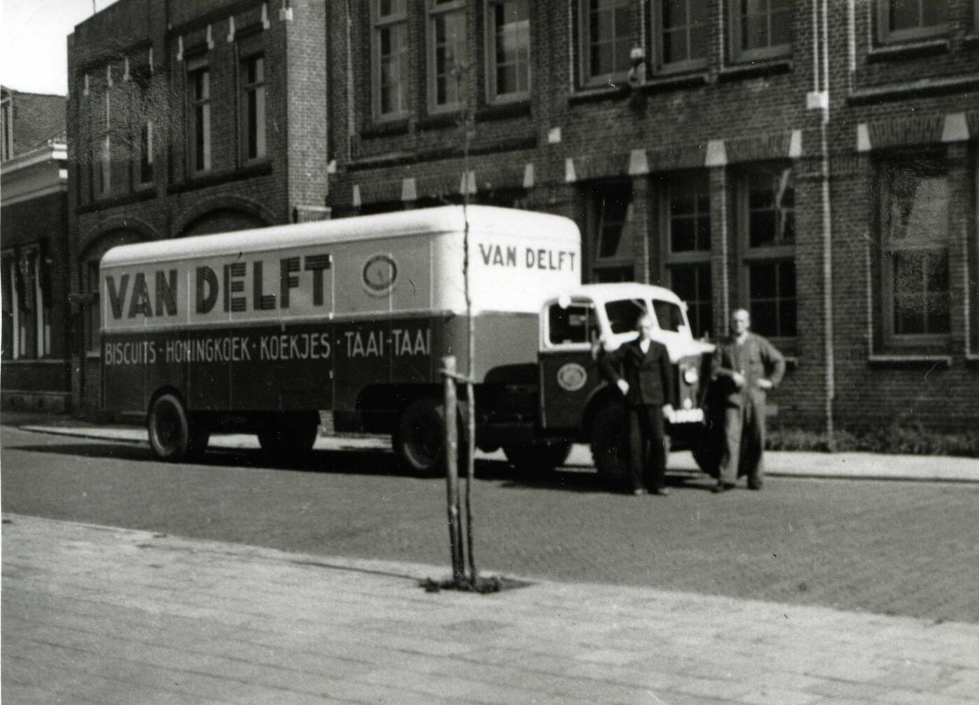 Op deze foto zie je een typische Van Delft-vrachtwagen uit het midden van de jaren ’50, voorzien van het kenmerkende logo. Met zulke betrouwbare wagens leverde Van Delft dagelijks versgebakken lekkernijen rechtstreeks bij winkels door heel Nederland, wat niet alleen de versheid garandeerde maar ook de naamsbekendheid versterkte.
